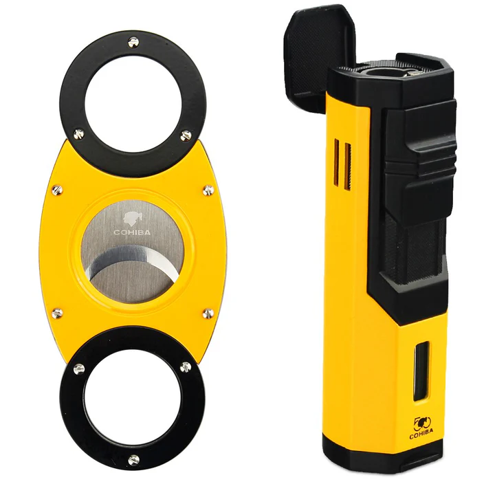 Enhance your cigar experience with the COHIBA Cigar Lighter Cutter Set, a luxury accessory designed for precision, convenience, and elegance. Combining a windproof torch jet flame lighter with a precision cutter, this set ensures your cigars are perfectly prepared and lit every time, making it an essential tool for enthusiasts and collectors alike.