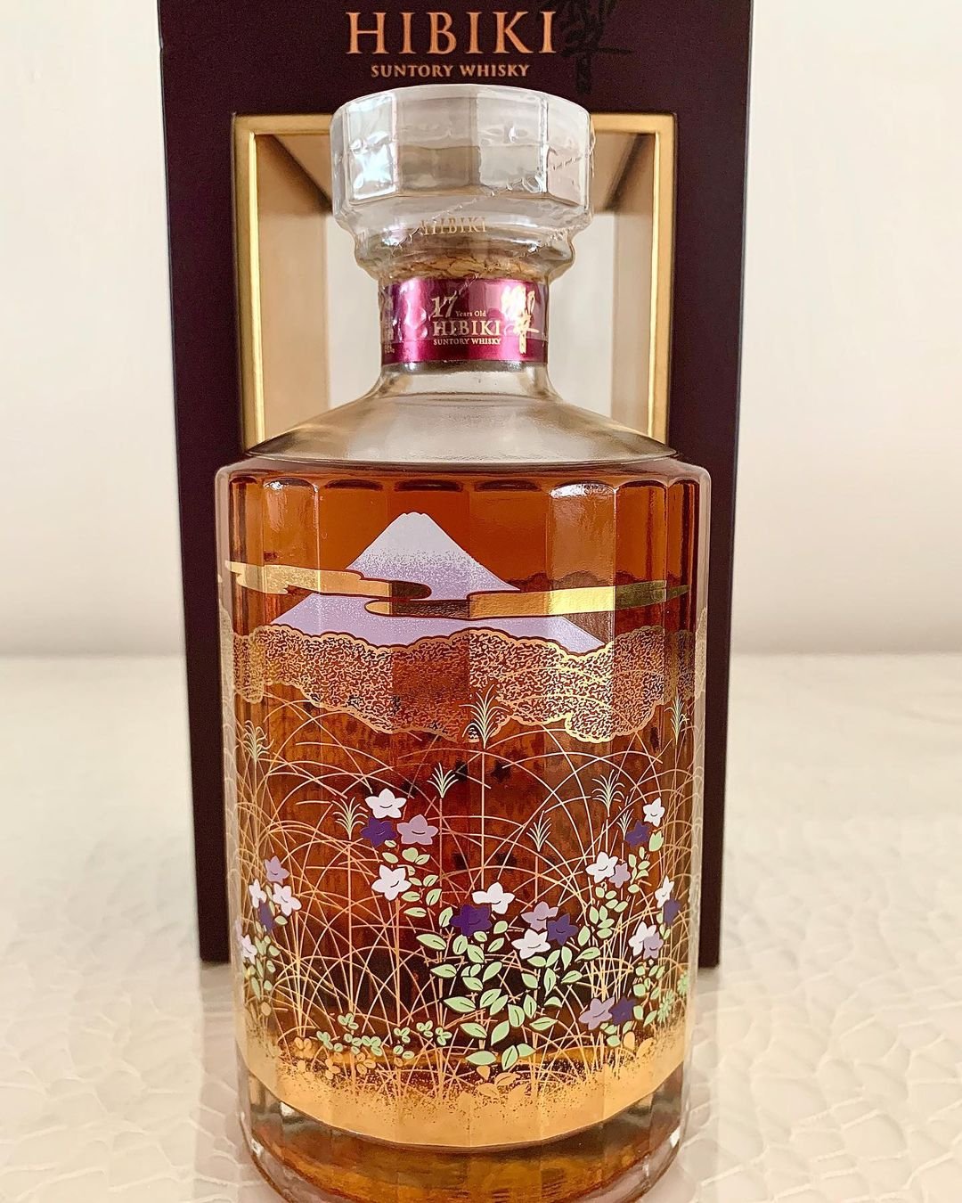 The Hibiki 17 Fuji bottle is a true work of art. The 24-faceted glass decanter, representing Japan’s 24 seasonal phases, features a stunning gold illustration of Mount Fuji and scenic cherry blossoms  an emblem of beauty and renewal. Each bottle embodies the harmony between nature and craftsmanship that defines the Hibiki spirit.