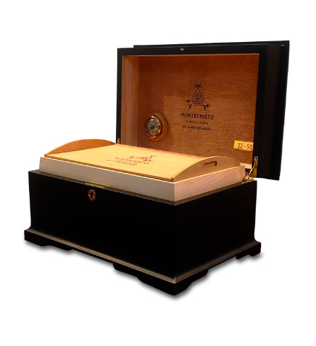 Crafted with meticulous attention to detail, the “Montecristo 80th Anniversary” humidr boasts: